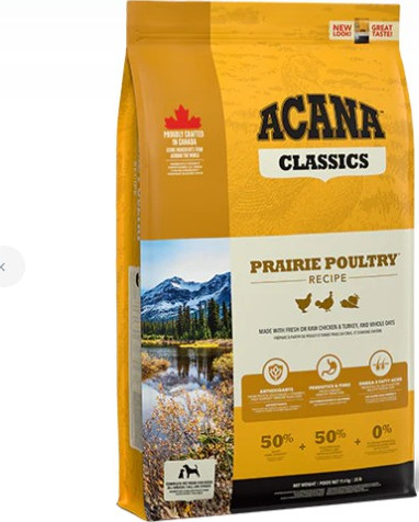 ACANA™ recipes are thoughtfully crafted from start to finish with delicious, quality ingredients. With a balanced 50/50 split between rich poultry ingredients and nutritious fruit, grains and vegetables, ACANA Classics Prairie Poultry recipe provides your dog with a filling and nutritious meal crafted from simple, wholesome ingredients. It also includes nutrient-rich ingredients that support three key health benefits, including immune function, healthy digestion, and healthy skin and coat. Feed your dog premium nutrition at a classic price with ACANA Classics Prairie Poultry recipe
