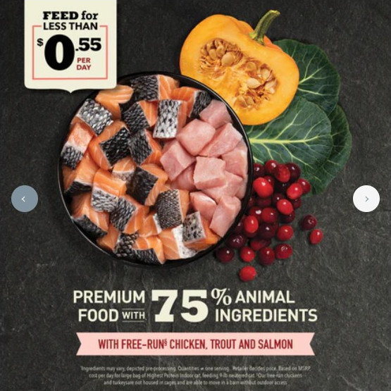 ACANA™ Highest Protein† Indoor Cat recipe is our first no added grains recipe for indoor cats! Rich with free-run chicken, trout and salmon, this premium recipe is crafted with 75% animal ingredients2 to satisfy your indoor feline’s craving for more protein. To help meet the unique needs of your indoor cat, it helps support 3 unique health benefits, including weight maintenance to help them maintain a healthy weight. A blend of probiotics and fiber help support digestive health and Omega-3 and Omega-6 fatty acids help support a healthy skin and a shiny coat. Nourish your indoor cat’s cravings for more animal protein while supporting their unique needs with ACANA Highest Protein Indoor Cat recipe!