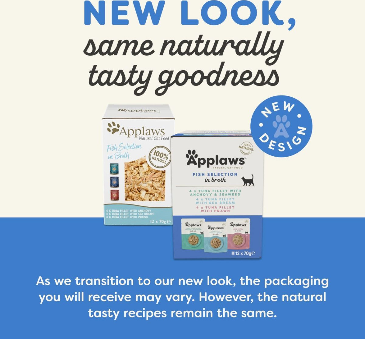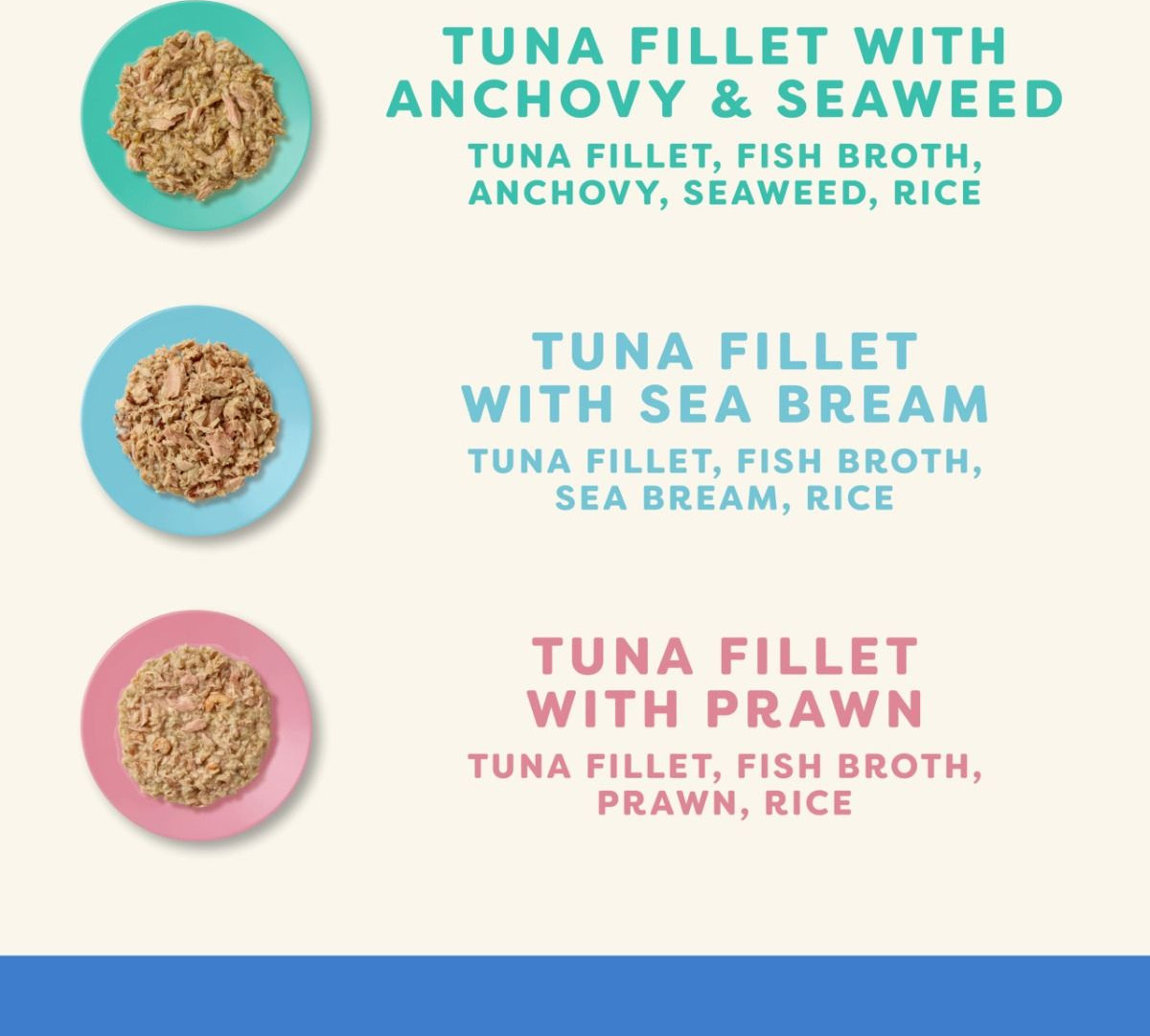 4 x tuna with seabream (Tuna Fillet 70%, Fish Broth, Sea Bream 5%, Brown Rice), 4 x tuna with prawn (Tuna Fillet 55%, Fish Broth, Pacific Prawn 20%, Rice), 4 x tuna with anchovy (Tuna Fillet 60%, Fish Broth, Anchovy 5%, Seaweed, Rice)