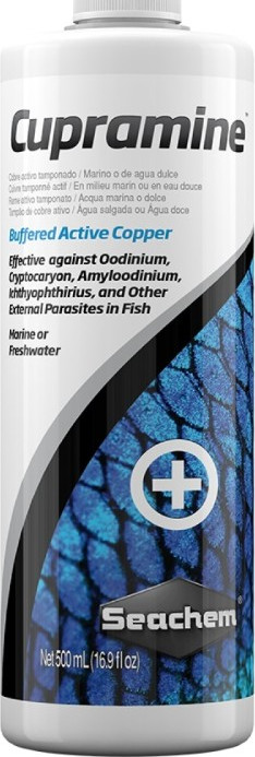 Cupramine effectively eradicates oodinium, cryptocaryon, amyloodinium, ichthyophthirius, and other ectoparasites of both freshwater and marine fish. It is superior to copper sulfate, chloride and citrate: it is non-acidic, less toxic to fish, remains in solution, and does not contaminate the filter bed. It is superior to chelates: it is fully charged (ionic), active at low concentrations, and is removable with carbon.
