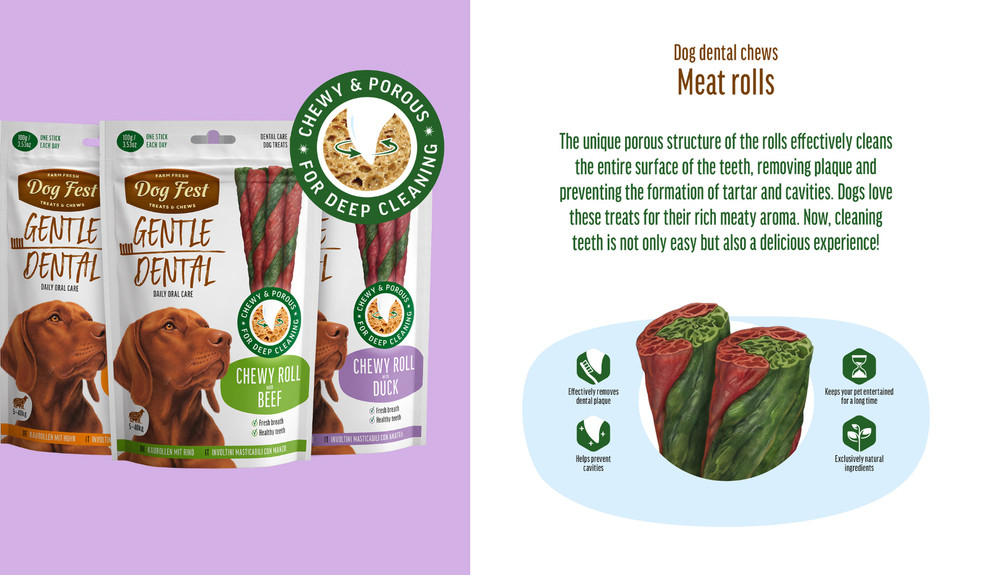 The unique porous structure of the rolls effectively cleans the entire surface of the teeth, removing plaque and preventing the formation of tartar and cavities. Dogs love these treats for their rich meaty aroma. Now, cleaning teeth is not only easy but also a delicious experience!