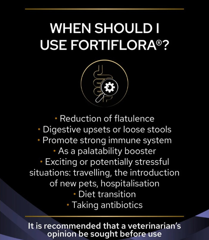 To help support immune system function, give 1 sachet of PRO PLAN FortiFlora every day. When feeding to restore intestinal microflora balance due to antibiotic use, give 1 sachet of PRO PLAN FortiFlora every day during the antibiotic course and for 1 week after the last dose of antibiotic. Ideally, PRO PLAN Fortiflora should be given at least 2 hours apart from any antibiotics.