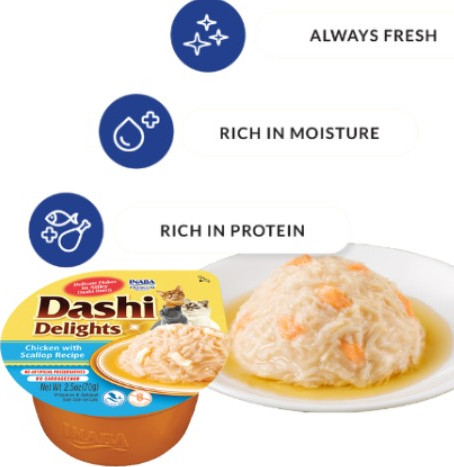 Inaba Dashi Delight Chicken with Scallop Recipe crafted from a delicate broth made from dried wild-caught tuna, mixed with shreds of carefully selected premium proteins, unleashing a new level of flavor for your cat. Every Inaba product is made with yummy high-quality ingredients, including farm-raised chicken and/or natural wild-caught tuna.