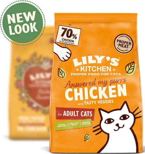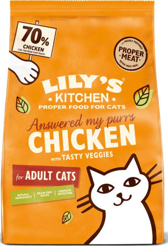 Made with 67% freshly prepared chicken, packed with tasty goodness that your kitty will adore. Grain free formula suitable for all cats above 12 month of age. Lily's Kitchen Delicious Chicken Complete Dry Food for Cats recipe has absolutely no grains, meat meal or artificial additives, just wonderful meaty goodness. In fact, Lily's Kitchen only use top tasty ingredients that are natural, which means they are naturally healthy for your cat too.
