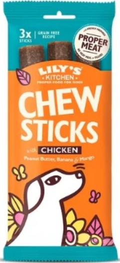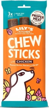 The Lily's Kitchen Dog Chew Sticks w/ Chicken Treats is a delicious grain free, chewy treat made with fresh chicken, peanut butter, banana & mango. Fruity and meaty! This nutritious dog treat is made with wholesome ingredients and botanicals to give your dog the very best of the countryside in a treat.