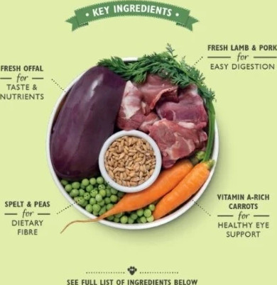 Ingredients - Lamb (26%); Pork (13%); Beef (10%), Organic Chicken 5%, Organic Vegetables 5% (Organic Carrots and Organic Peas), Organic Spelt, Vitamins and Chelated Minerals, Organic Alfalfa, Organic Cleavers, Organic Kelp, Organic Spirulina.