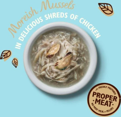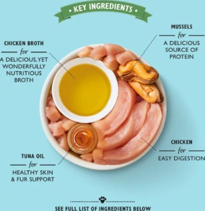 Ingredients - Freshly Prepared Chicken (45%), Mussels (3%), Chicken Broth (47%), Sunflower Oil, Minerals, Tapioca, Tuna Oil.