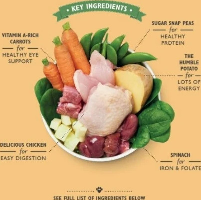 Ingredients - Chicken (60%); Potatoes (4%); Sugar Snap Peas (2%) , Carrots, Spinach, Apples, Vitamins and Chelated Minerals, Herbs, Safflower Oil. *Herbs & botanicals: Golden Rod, Nettle, Aniseed, Celery Seed, Rosehips, Marigold Petals, Cleavers, Seaweed, Alfalfa, Milk Thistle, Dandelion Root, Burdock Root.