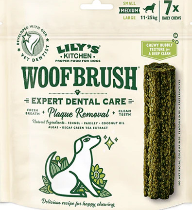 The Woofbrush has been carefully crafted in Lily's Kitchen with help from their pet dental expert to make sure it works and tastes great, Using top-notch natural ingredients like parsley, coconut oil, and fennel for a proper clean without the added nonsense. We recommend a Woofbrush a day to help support your dog’s dental health and this pack of 7 dental chews is just right for larger dogs (over 26kg) to have one each day of the week. Suitable from 6 months old.