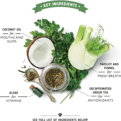 Ingredients - Potato Flour, Tapioca Starch, Glycerine, Cellulose, Nutritional Yeast, Algae (2.2%), Fennel (0.3%), Coconut Oil (0.3%), Green Tea Extract (0.2%), Parsley (0.1%).