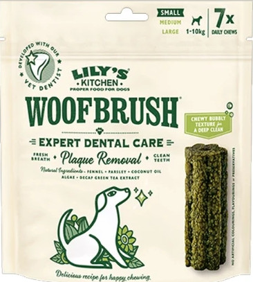 The Woofbrush has been carefully crafted in Lily's Kitchen with help from their pet dental expert to make sure it works and tastes great, Using top-notch natural ingredients like parsley, coconut oil, and fennel for a proper clean without the added nonsense. We recommend a Woofbrush a day to help support your dog’s dental health and this pack of 7 dental chews is just right for larger dogs (over 26kg) to have one each day of the week. Suitable from 6 months old.
