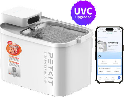 EVERSWEET MAX 2 (CORDLESS/UVC) PET WATER FOUNTAIN is equipped with a wireless UVC pump that eliminates exposed wires and helps reduce bacterial buildup for safer hydration. Built with dishwasher-safe, heat-resistant materials and a stainless steel tray that resists biofilm, it’s durable and easy to maintain. With three drinking modes, App monitoring, and 83 days of cordless battery life, it delivers clean, convenient, and reliable hydration for pets.
