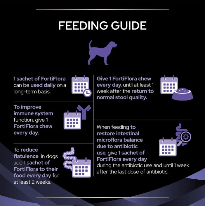 To help support immune system function, give 1 sachet of PRO PLAN FortiFlora every day. When feeding to restore intestinal microflora balance due to antibiotic use, give 1 sachet of PRO PLAN FortiFlora every day during the antibiotic course and for 1 week after the last dose of antibiotic. Ideally, PRO PLAN Fortiflora should be given at least 2 hours apart from any antibiotics.