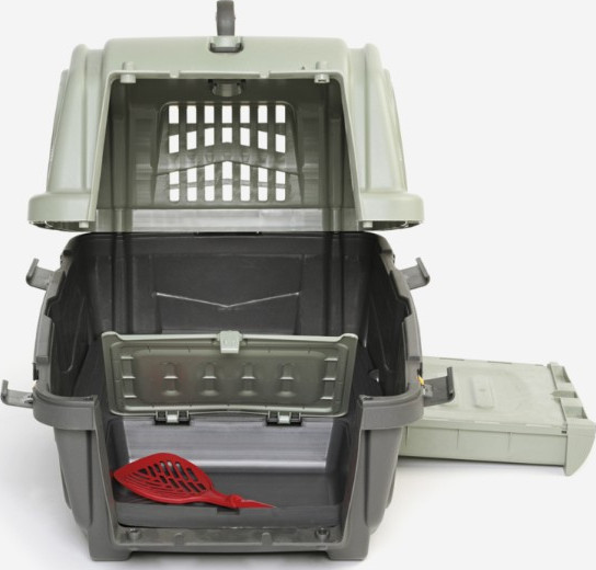 Single carrier with integrated litter. Consisting of a base with drawer to allow the cat to do its business without leaving the carrier on long journeys.