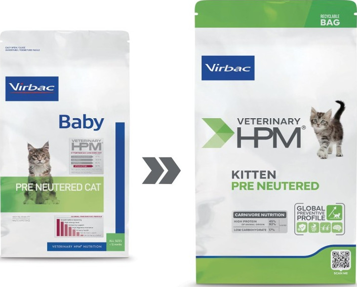 - Support Skin and coat health VETERINARY HPM Pre Neutered Kitten helps support your kitten's skin and coat health by providing quality animal proteins rich in sulphur amino acids, along with the ideal balance of omega-3 and omega-6 fatty acids.
