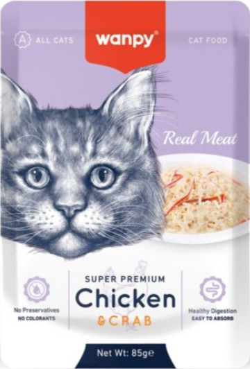 Wanpy Super Premium Chicken & Crab is packed with real meat strips in a tasty jelly suitable for cats of all ages. Serve straight from the pouch, crumble over a plate, or use as a topper for dry food to boost meals with protein and delicious taste.