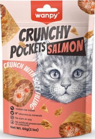 WANPY Crunchy Pockets Salmon & Roe Recipe offer a double-layered treat with a crunchy shell and a soft, savory center made from select real salmon and roe for an irresistible bite every time.