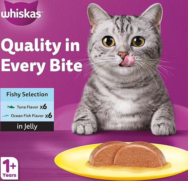- FISHY SELECTION IN JELLY: Your cat will indulge in the delicacy of the Whiskas Wet Cat Food’s Fishy Selection, with 12 wet food pouches, 6 with tuna and 6 with oceanfish, prepared in rich jelly, to satisfy all its palates.