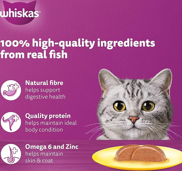 - 41 ESSENTIAL NUTRIENTS: This Whiskas cat food is enriched with 41 essential nutrients for cats to be active, and vitamins and minerals for an effective body system. It contains omega 6, biotin and zinc to maintain your cat’s skin and coat