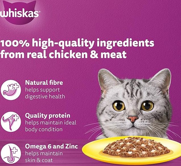 - 41 ESSENTIAL NUTRIENTS: This Whiskas cat food is enriched with 41 essential nutrients for cats to be active, and vitamins and minerals for an effective body system. It contains omega 6, biotin and zinc to maintain your cat’s skin and coat