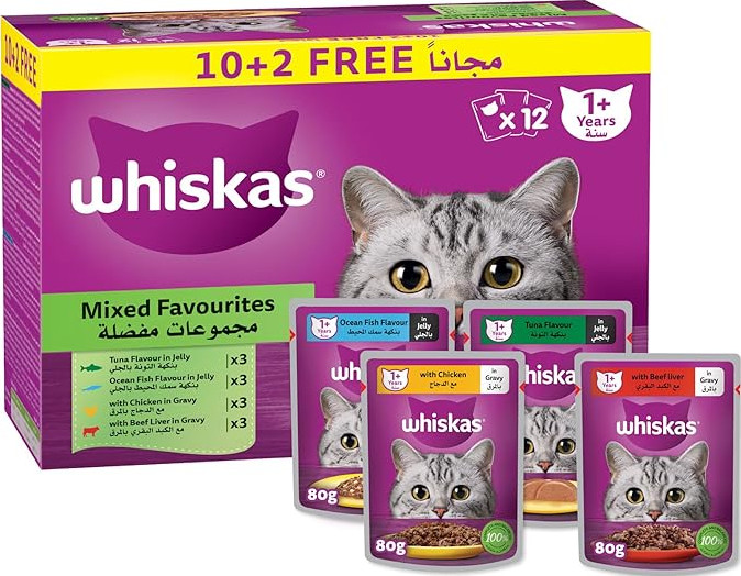 - MIXED FAVORITES IN JELLY AND IN GRAVY: Whiskas Wet Cat Food offers a mixed favorites 12 packs of wet food, 3 pouches of each flavor including, Oceanfish in Jelly, Tuna in Jelly, Beef Liver in Gravy, and Chicken in Gravy, to satisfy all its palates
