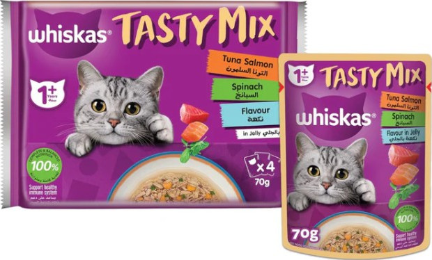Product Description Whiskas Tasty Mix Tuna, Salmon & Spinach in Jelly Wet Cat Food - 4X70G