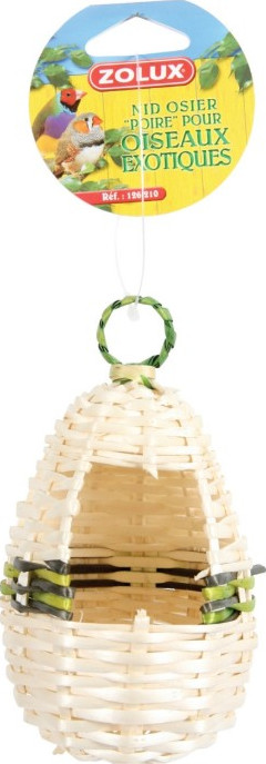 This wicker nest in pear shape has a front opening. It has a handle to be hanged. Brighten with a green and brown colored line. Partially closed, this is a safe and quiet place for chicks.