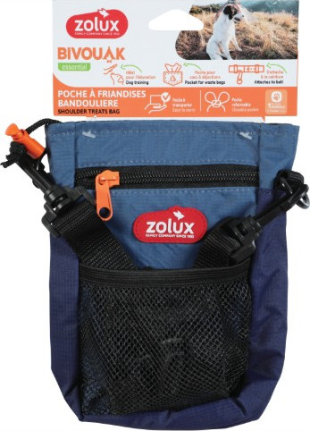 The Zolux Bivouak Essential treat bag designed to be worn across the body or over the shoulder for convenient access during dog training and walks. It features a secure zippered main compartment, a front mesh pocket (likely for waste bags), and comfortable carrying options. It's designed with practicality and ease of use in mind for dog owners.