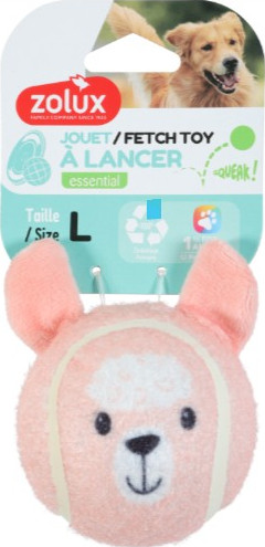 This is a large-sized Zolux Essential fetch toy. It's a tennis ball covered in light pink felt and designed to look like a llama, complete with facial features and ears. It contains a squeaker to entice play and has a 100% polyester filling for any soft parts.