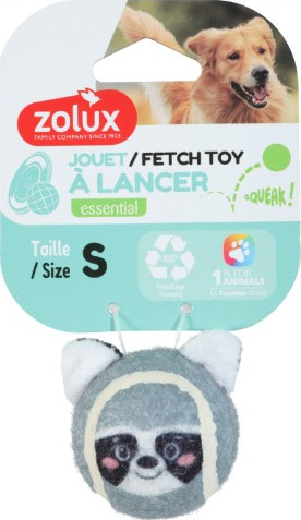 This is a small-sized Zolux Essential fetch toy. It's a tennis ball covered in grey felt and designed to look like a raccoon, complete with facial features and ears. It contains a squeaker to entice play and has a 100% polyester filling for any soft parts.