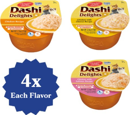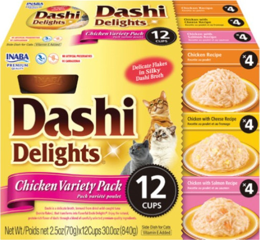 Inaba Dashi Delight Chicken Variety crafted from a delicate broth made from dried wild-caught tuna, mixed with shreds of carefully selected premium proteins, unleashing a new level of flavor for your cat. Every Inaba product is made with yummy high-quality ingredients, including farm-raised chicken and/or natural wild-caught tuna.