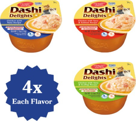 Inaba Dashi Delight Tuna variety crafted from a delicate broth made from dried wild-caught tuna, mixed with shreds of carefully selected premium proteins, unleashing a new level of flavor for your cat. Every Inaba product is made with yummy high-quality ingredients, including farm-raised chicken and/or natural wild-caught tuna.